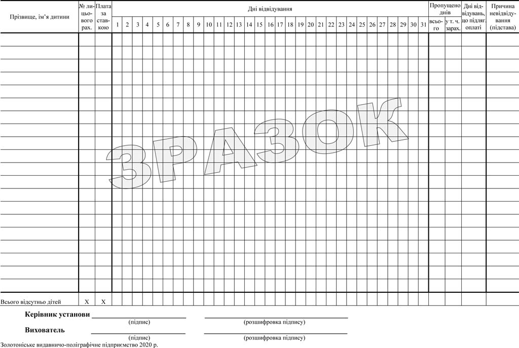 Бланк «Табель обліку відвідувань дітей» форма №305 – папір газетний, формат А4, друк двосторонній.
