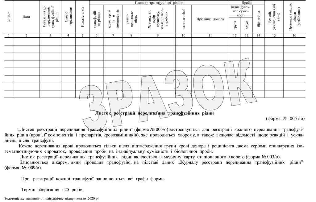 Бланк форми №005/о «Листок реєстрації переливання