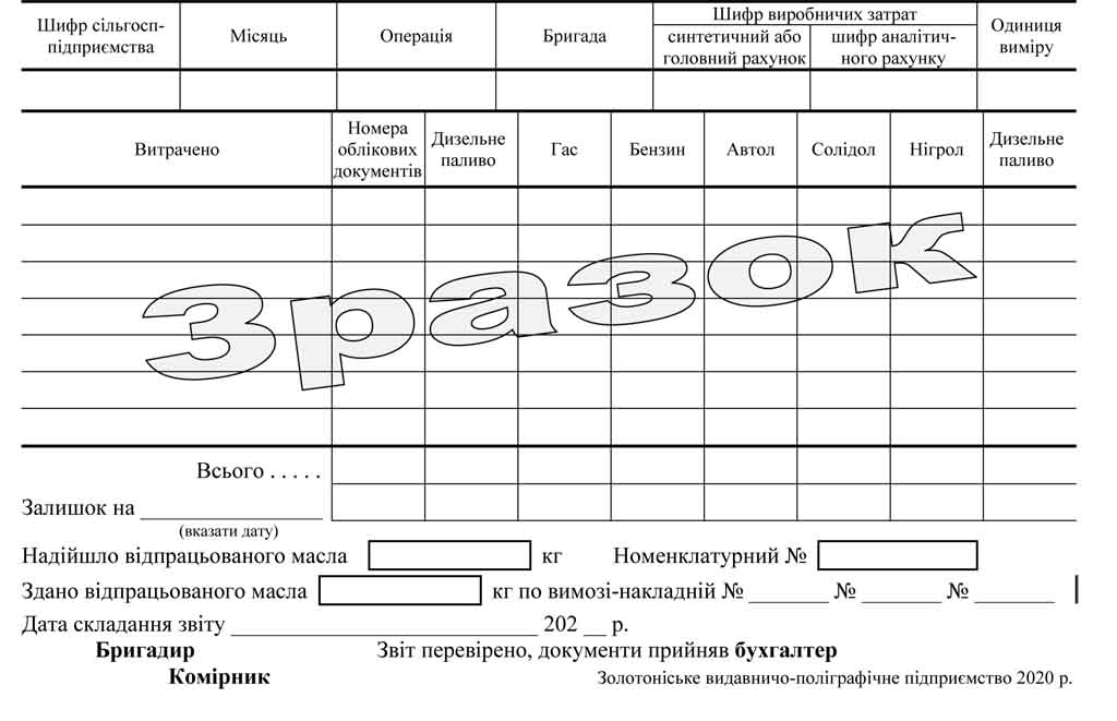 Бланк «Звіт №___ про рух пального та мастил» форма № 120 – папір газетний, формат А5, друк двосторонній