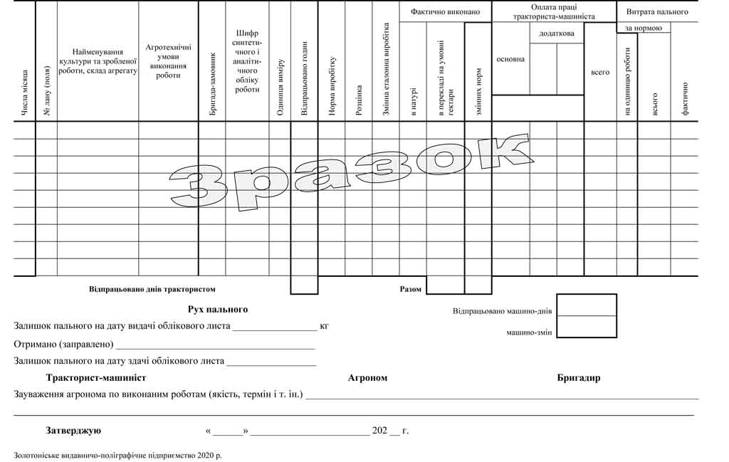 Бланк «Обліковий лист №___ тракториста-машиніста» форма № 67-6 – папір газетний, формат А4, друк двосторонній