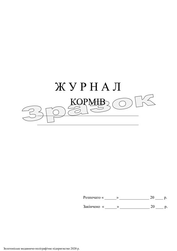 Журнал кормів – формат А4 (книжна орієнтація), папір газетний, 50 листів, метод зшивання – скоба, палітурка – папір кольоровий щільністю 160г/м2.