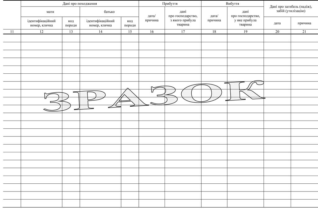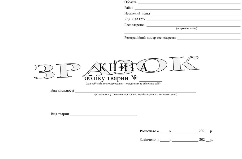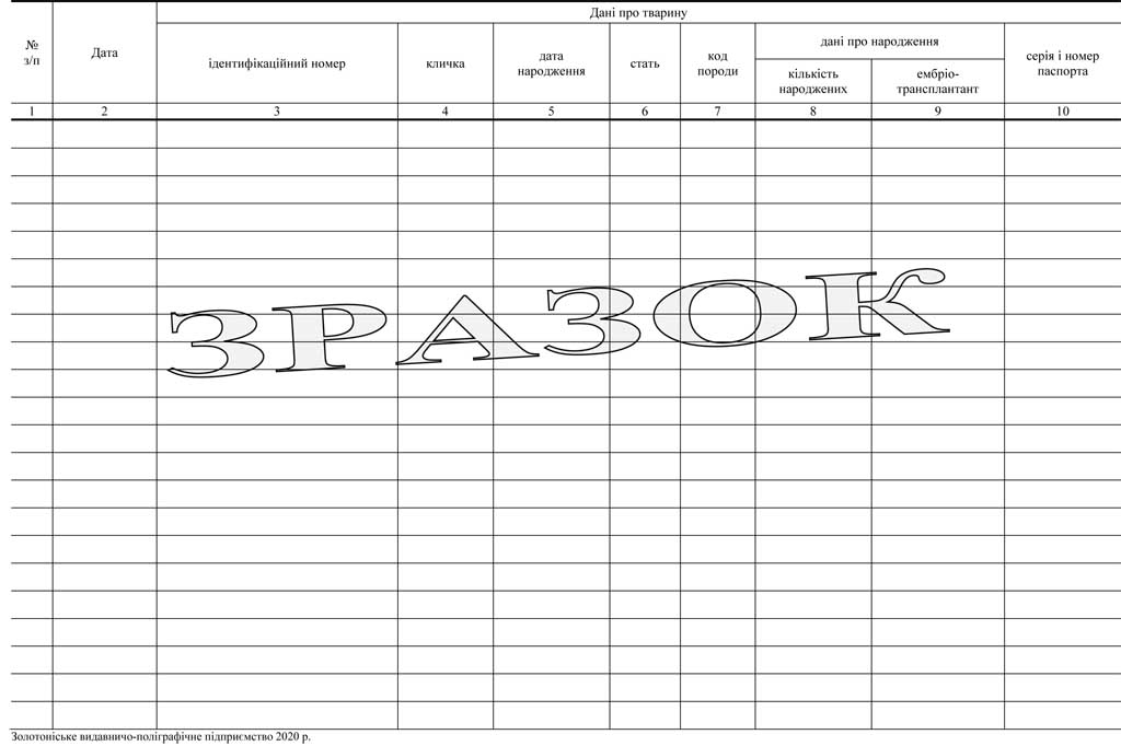 Книга обліку тварин - формат А4 (альбомна орієнтація), папір газетний, 50 листів, метод зшивання – скоба(по вужчому краю) + папір, палітурка - папір кольоровий щільністю 160г/м2.