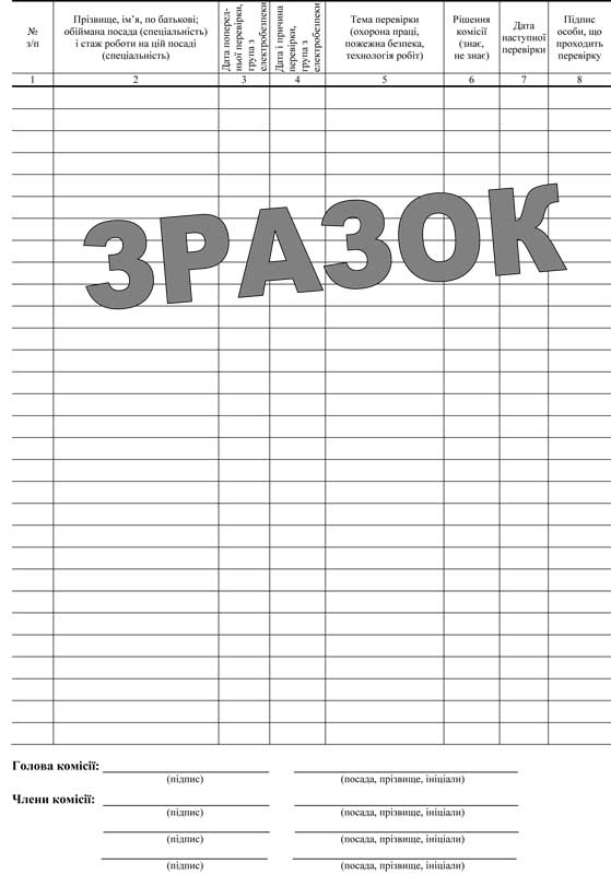 Журнал протоколів перевірки знань – формат А4, папір газетний, орієнтація книжна, 50 листів, палітурка - кольоровий папір щільністю 160г/м2, метод зшивання –скоба.