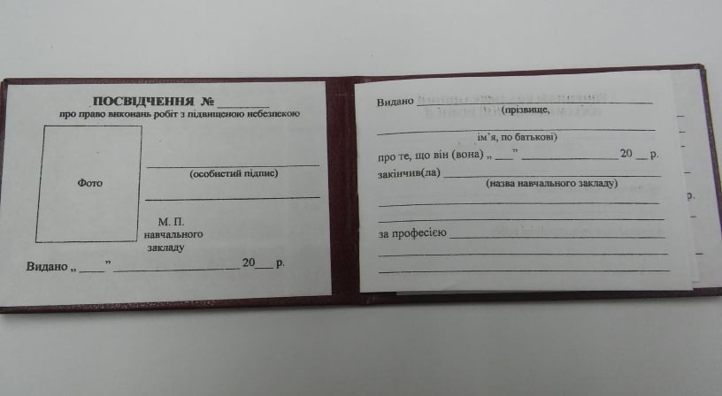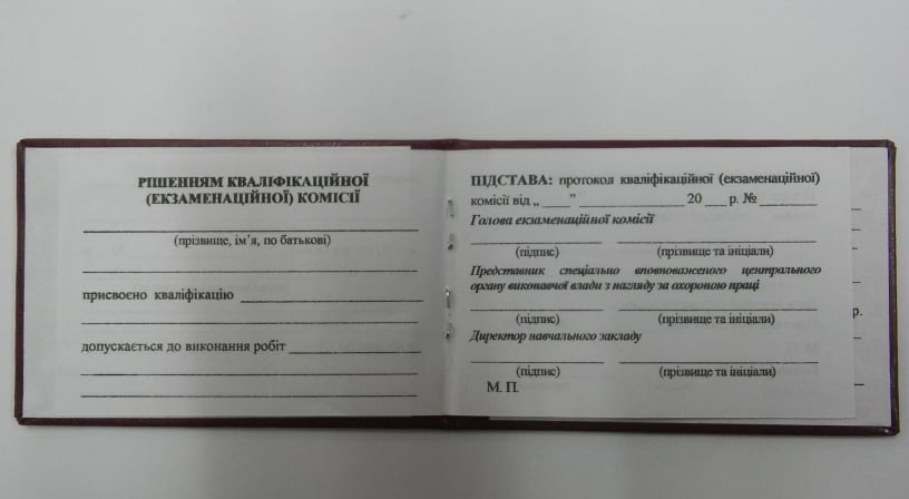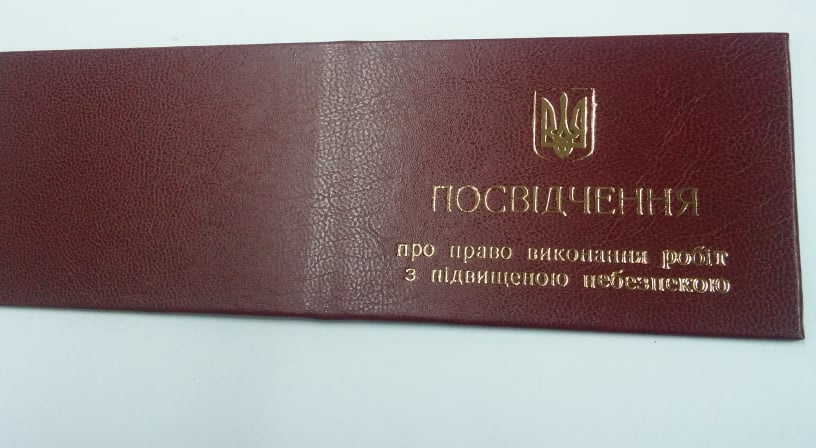Посвідчення про право виконання робіт з підвищеною небезпекою - розмір в розгорнутому вигляді 210*70, 6 сторінок, папір ксероксний 80г/м2,картон палітурний 1050, покровний матеріал Аріан (штучна шкіра), тиснення золотом, скоба