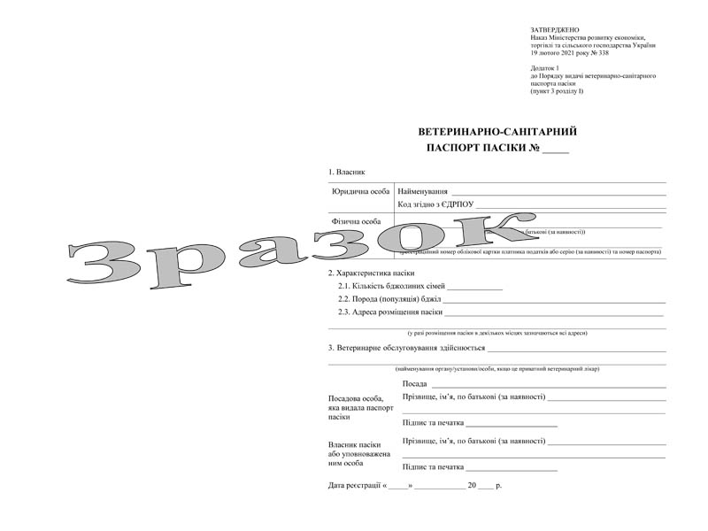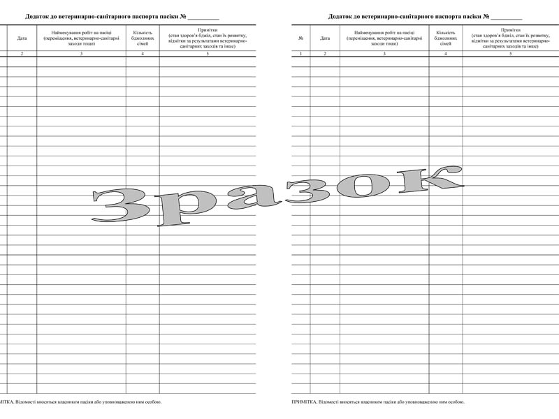Ветеринарно-санітарний паспорт пасіки (затверджена форма наказом №338 від 19.02.2021) - папір офсетний, 50 листів, формат А4, обкладинка - кольоровий картон щільністю 160 г/м2 жовтого пастельного віддтінку, метод зшивання - скоба в згин.